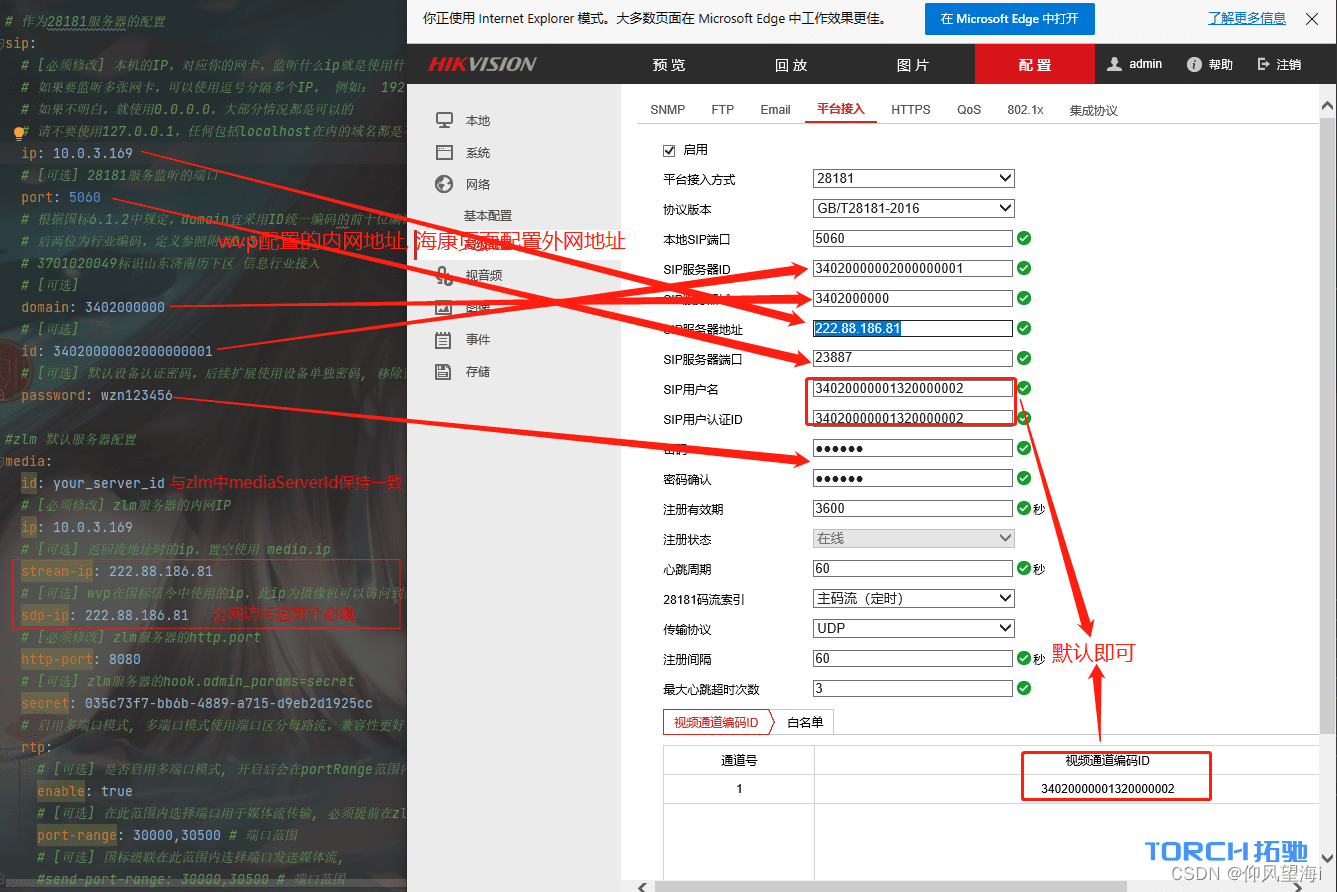 设备注册上来之后修改收流ip(公网地址)和密码(海康28181页面密码), 选择部署的zlm节点